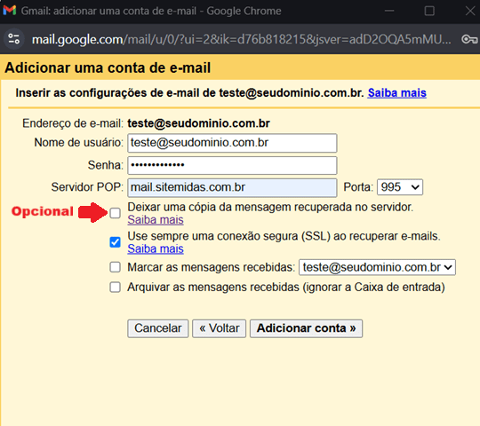 (OPCIONAL) Marque a opção para deixar uma cópia, caso deseje apenas baixar seus emails para o Gmail, sem apagar do servidor.