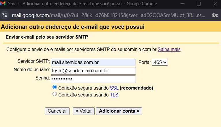 Observação: A opção Conexão segura usando SSL tem que deixar marcado.
