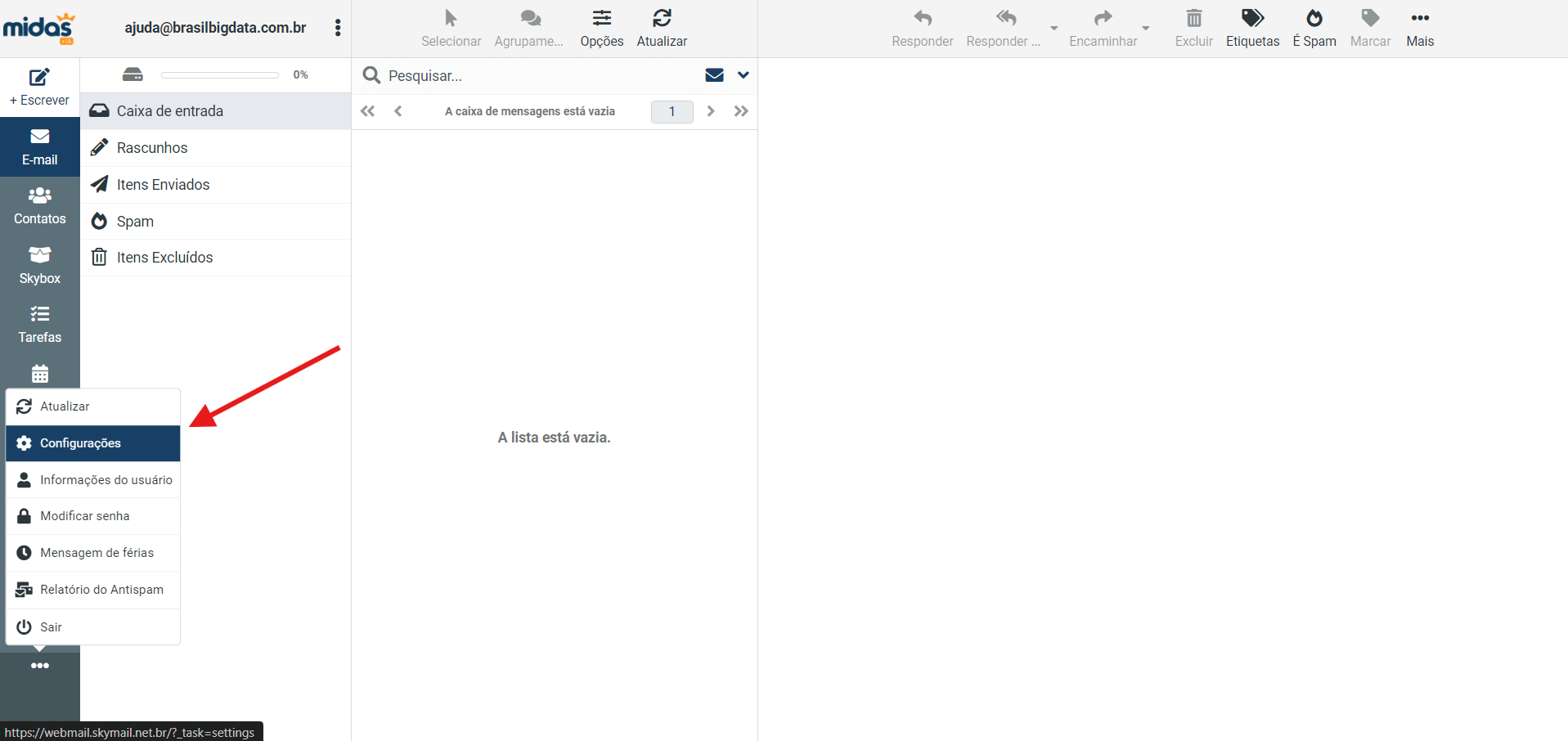 1 – Acesse a sua conta no Webmail, clique nos três pontos no canto inferior esquerdo e selecione a opção Configurações.