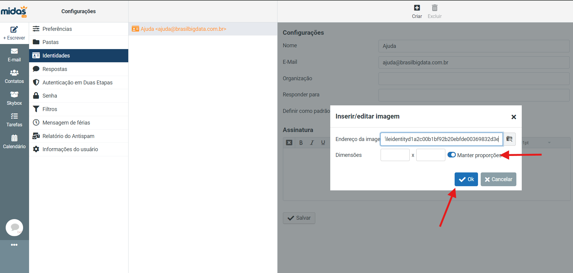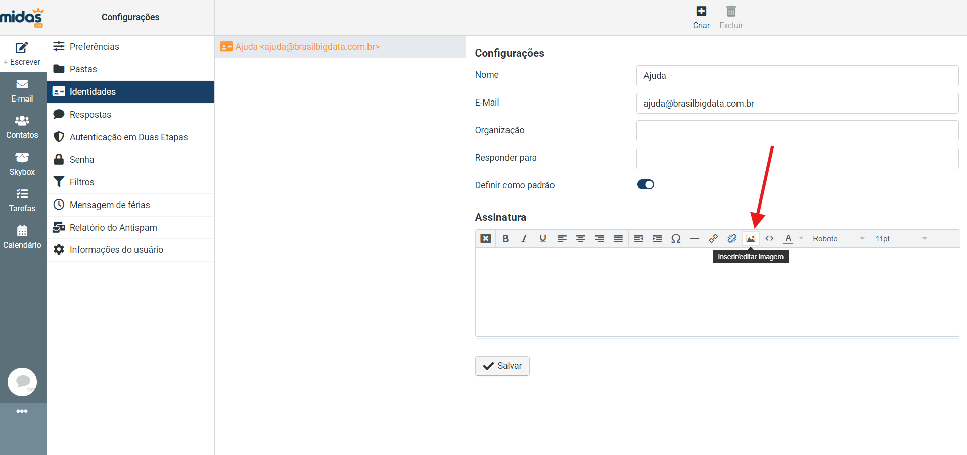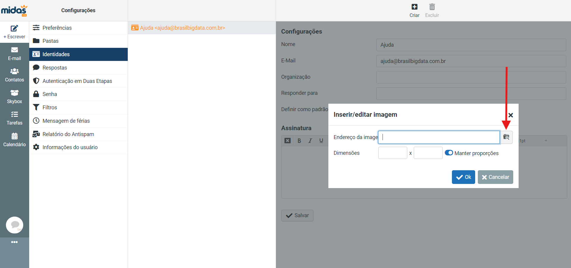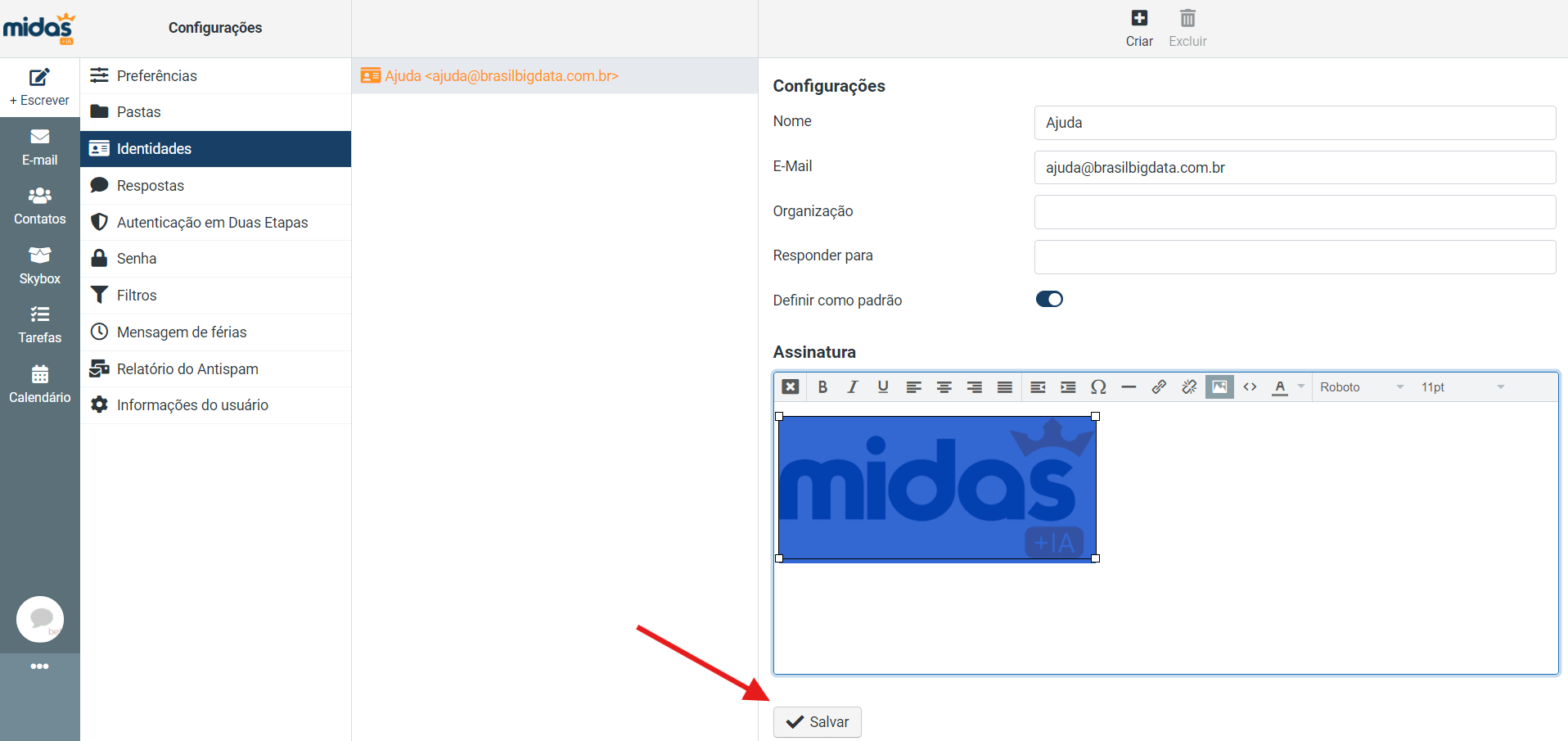 3 – Na tela de Identidades, selecione o e-mail o qual deseja adicionar a assinatura.