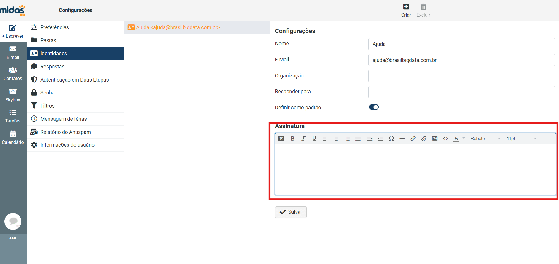 4 – Será exibida a página de edição da assinatura. Onde é possível realizar a criação de sua assinatura. No campo de edição da assinatura, você possui funcionalidades de edição como: fonte utilizada, tamanho da fonte, negrito e itálico, inserção de links, entre outros.